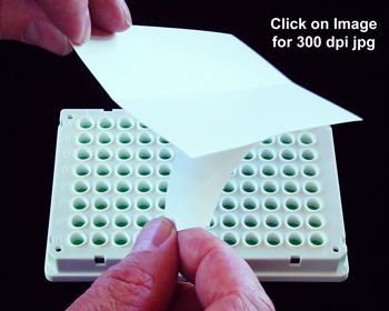 A split backing facilitates application of the film to either top or bottom of the plate. Applied to the bottom of a 96-well filter plate, the white film provides a convenient medium for holding dried filters removed from the plate for microscopic examination and storage, for example in ELISPOT techniques.