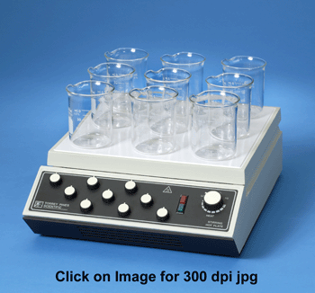 The 5-position stirring units can stir 5-800ml beakers, and the 9-position units can stir 9-500ml beakers of aqueous solutions with a stirring range from 100 to 1500 rpm.